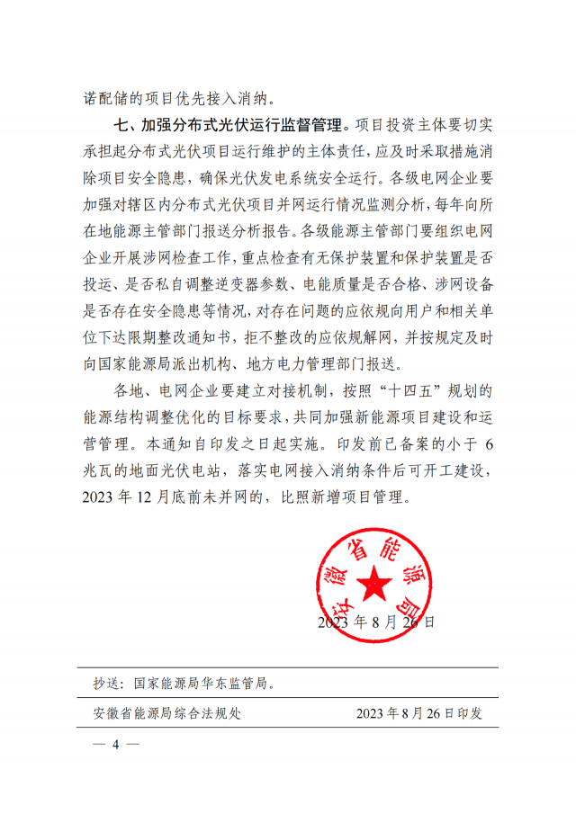 另外,印發(fā)前已備案的小于6兆瓦的地面光伏電站,落實(shí)電網(wǎng)接入消納條件后可開(kāi)工建設(shè),2023年12月底前未并網(wǎng)的,比照新增項(xiàng)目管理。