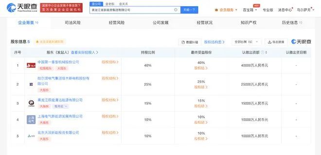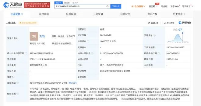 天眼查App顯示,11月20日,黑龍江省新能源集團(tuán)有限公司成立,法定代表人為劉軼,注冊(cè)資本10億人民幣,經(jīng)營(yíng)范圍含新興能源技術(shù)研發(fā)、風(fēng)電場(chǎng)相關(guān)系統(tǒng)研發(fā)、以自有資金從事投資活動(dòng)、風(fēng)力發(fā)電技術(shù)服務(wù)、太陽能發(fā)電技術(shù)服務(wù)、儲(chǔ)能技術(shù)服務(wù)、工程管理服務(wù)等。股東信息顯示,該公司由中國(guó)一重(601106)、佳電股份(000922)、黑龍江辰能清潔能源有限公司、上海電氣新能源發(fā)展有限公司、北京天潤(rùn)新能投資有限公司共同持股。