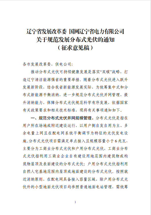 2023年11月28日,遼寧省發(fā)展改革委發(fā)布了關(guān)于規(guī)范發(fā)展分布式光伏的通知(征求意見稿)》 公開征求意見的公告。