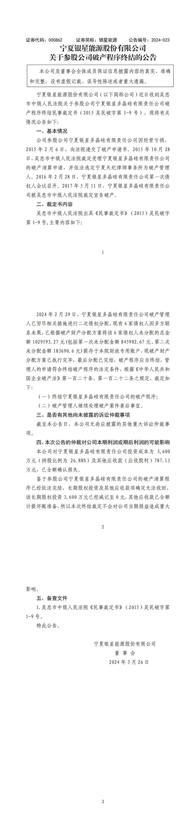公司參股公司寧夏銀星多晶硅有限責任公司因經(jīng)營虧損,2015年2月6日,向法院遞交了破產(chǎn)申請書。2015年10月28日,吳忠市中級人民法院裁定受理寧夏銀星多晶硅有限責任公司的破產(chǎn)清算申請,并依法選定寧夏天紀律師事務所為破產(chǎn)管理人。2016年2月28日,寧夏銀星多晶硅有限責任公司第一次債權人會議召開。2017年5月11日,寧夏銀星多晶硅有限責任公司被吳忠市中級人民法院裁定宣告破產(chǎn)。2024年2月29日,吳忠市中級人民法院裁定如下:終結寧夏銀星多晶硅有限責任公司的破產(chǎn)程序,破產(chǎn)管理人繼續(xù)處理破產(chǎn)案件善后事宜。