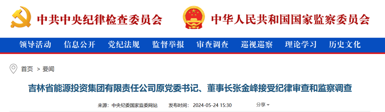 中央紀(jì)委國(guó)家監(jiān)委網(wǎng)站5月24日消息,據(jù)吉林省紀(jì)委監(jiān)委消息:吉林省能源投資集團(tuán)有限責(zé)任公司原黨委書記、董事長(zhǎng)張金峰涉嫌嚴(yán)重違紀(jì)違法,目前正接受吉林省紀(jì)委監(jiān)委紀(jì)律審查和監(jiān)察調(diào)查。