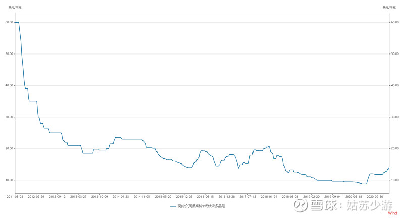 這是2011年至今的硅料價格,當年保利協(xié)鑫的產(chǎn)能釋放完畢,硅料價格從100美元/kg跌到20美元/kg。