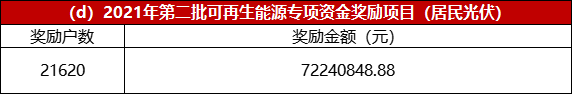 而2021年第二批光伏專項(xiàng)資金獎(jiǎng)勵(lì)項(xiàng)目共計(jì)22894個(gè),獎(jiǎng)勵(lì)金額2.68億。其中光伏電站項(xiàng)目13個(gè),獎(jiǎng)勵(lì)金額3531千萬;企業(yè)光伏項(xiàng)目1261個(gè),獎(jiǎng)勵(lì)金額1.605億;居民光伏21620戶,獎(jiǎng)勵(lì)金額7224千萬。