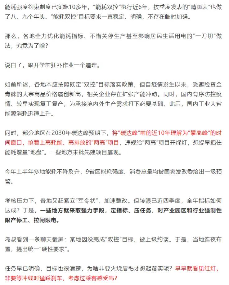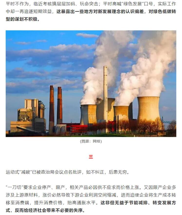 在這一政策的影響下,各地政府層層加碼,許多企業(yè)生產陷入停滯,甚至有部分地區(qū)居民生活用電、用水也受到影響。對此,人民日報海外版《俠客島》評論稱,平時不作為,臨近考核搞層層加碼、玩命突擊;平時高喊“綠色發(fā)展”口號,實際工作中卻一再追逐短期效益,這暴露出一些地方對新發(fā)展理念的認識偏差,對綠色低碳轉型的謀劃不積極,“跟開學前狂補作業(yè)一個道理。”