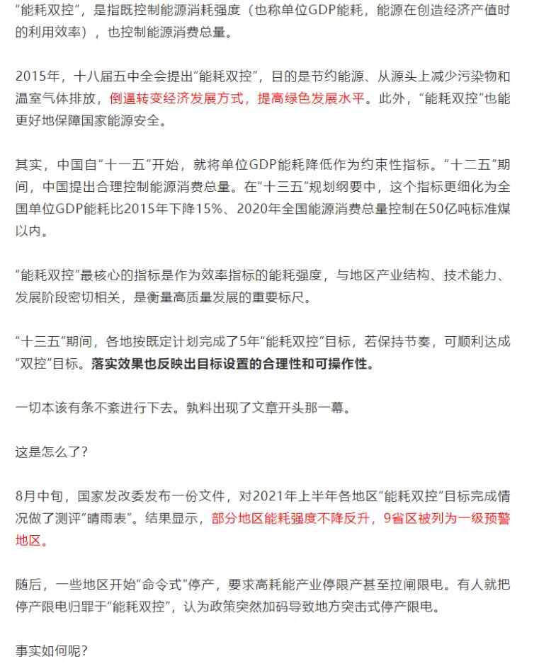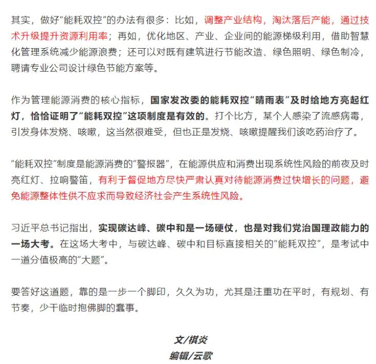 編者按:9月11日,國家發(fā)展改革委印發(fā)《完善能源消費強度和總量雙控制度方案》,要求各地政府以能源資源配置更加合理、利用效率大幅提高為導向,以建立科學管理制度為手段,以提升基礎能力為支撐,強化和完善能耗雙控制度,深化能源生產和消費革命,推進能源總量管理、科學配置、全面節(jié)約,推動能源清潔低碳安全高效利用,倒逼產業(yè)結構、能源結構調整,助力實現(xiàn)碳達峰、碳中和目標,促進經濟社會發(fā)展全面綠色轉型和生態(tài)文明建設實現(xiàn)新進步。