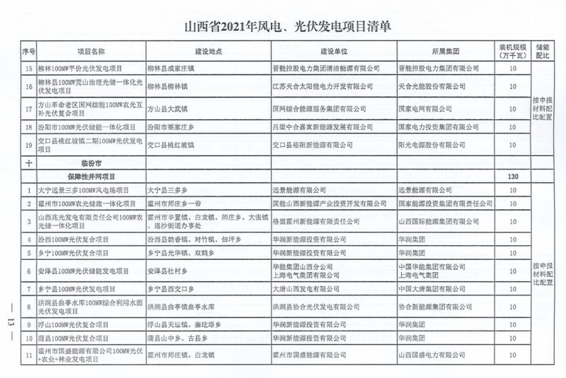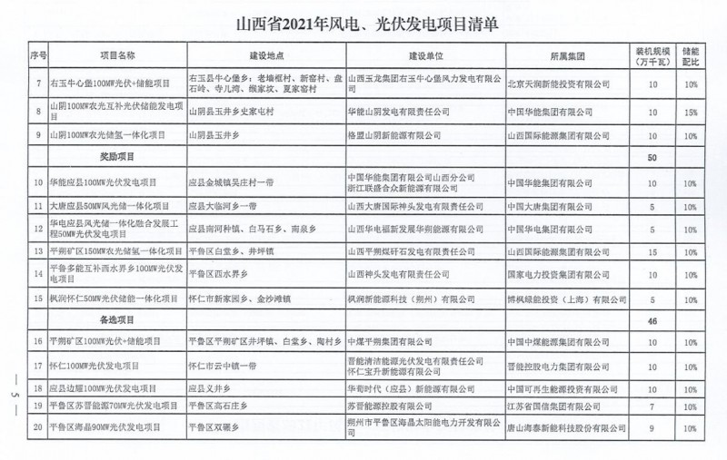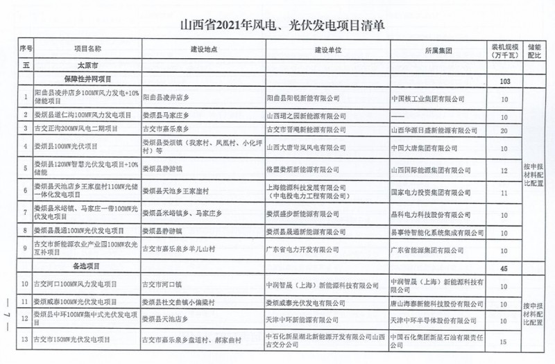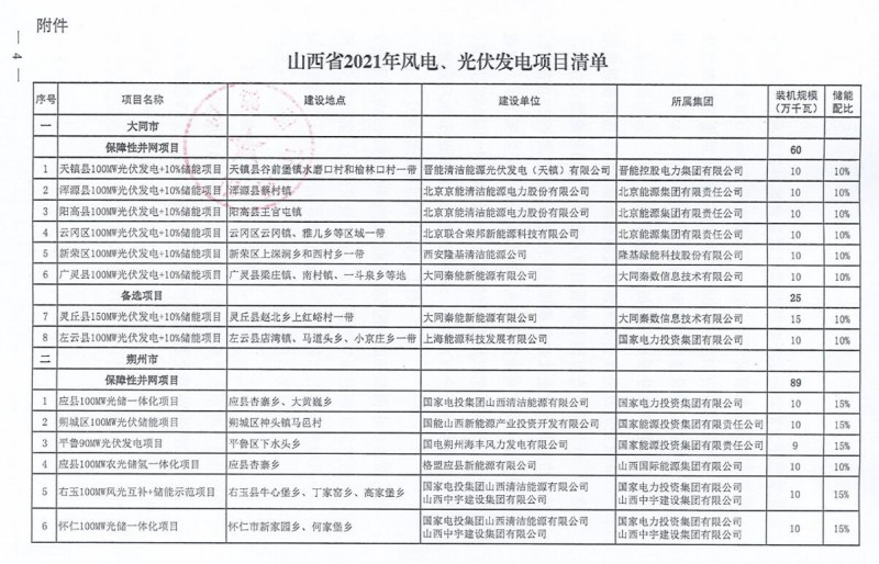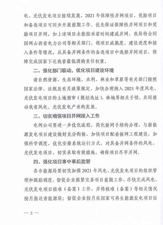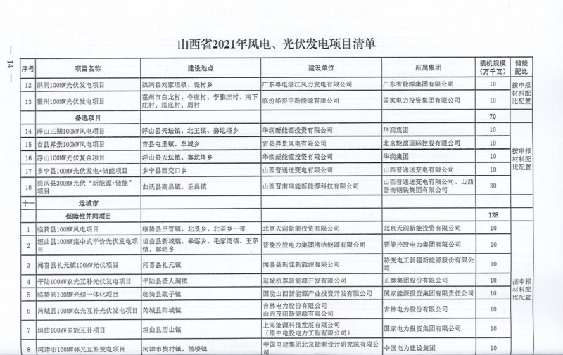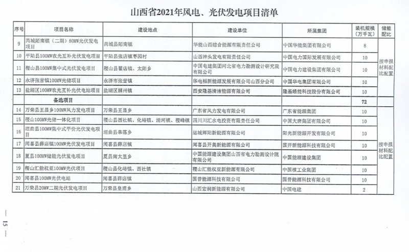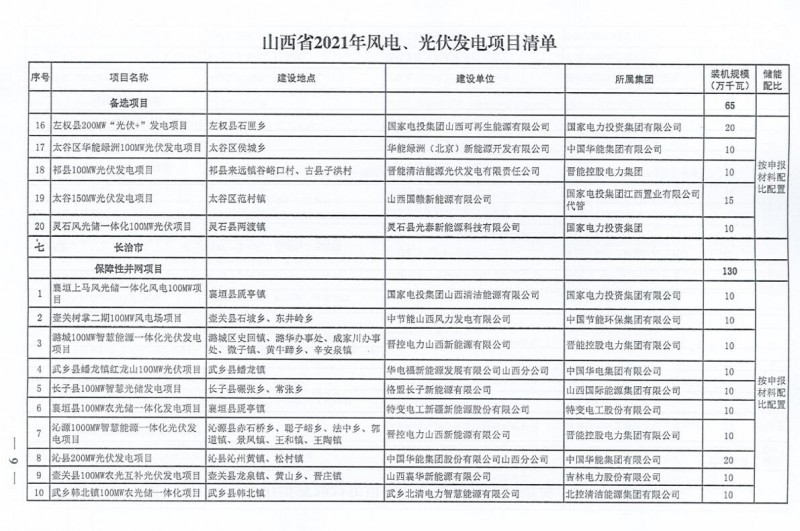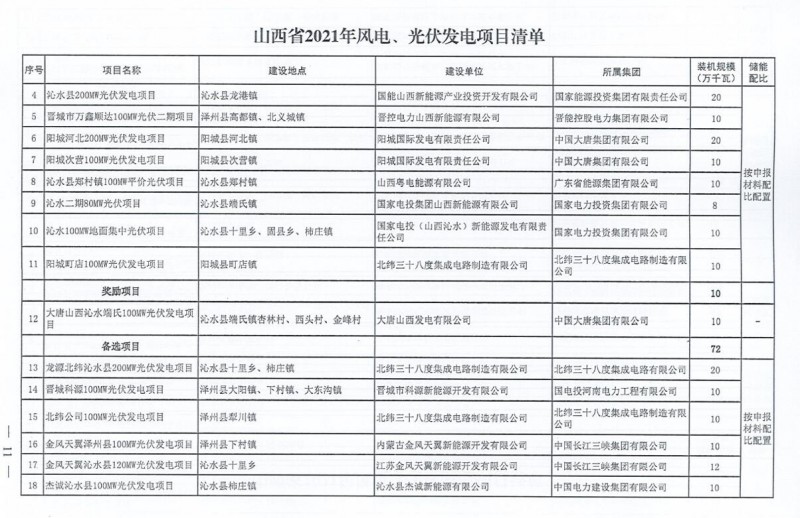 10月22日,山西省能源局下達(dá)2021年度風(fēng)電、光伏發(fā)電保障性并網(wǎng)年度建設(shè)計劃。風(fēng)、光合計17.792GW,其中保障性11.2GW+獎勵700MW+備選5.892GW。文件明確保障性規(guī)模與獎勵規(guī)??赏介_展前期工作,優(yōu)先保證保障性并網(wǎng)項目和獎勵項目并網(wǎng),如上述項目未能按承諾時間并網(wǎng),將視項目成熟度、建設(shè)進(jìn)度和接入條件等,從備選項目中選擇并網(wǎng)項目,保障完成國家下達(dá)的最低消納責(zé)任權(quán)重。