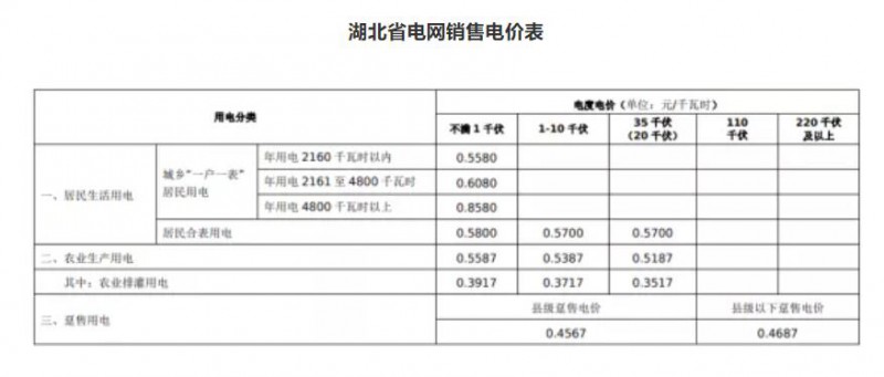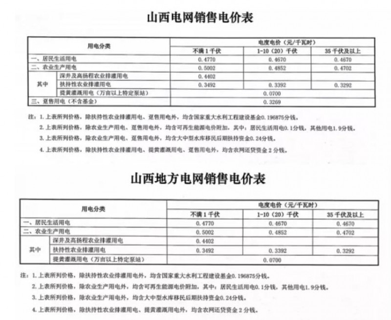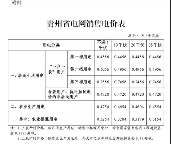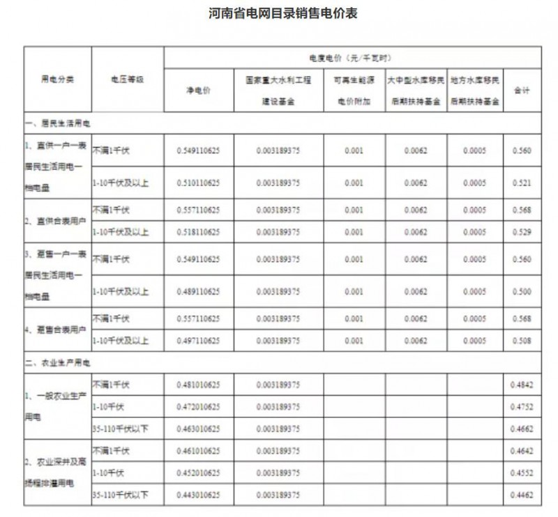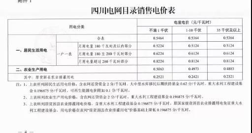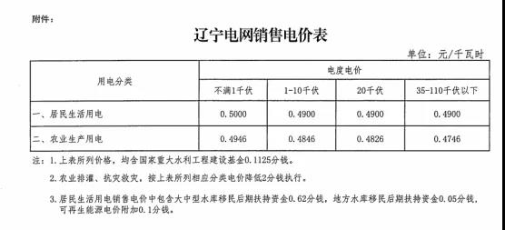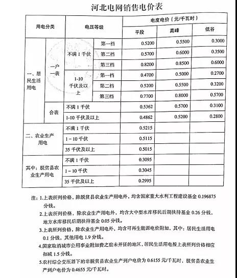 注:1、上表所列價格,除已摘帽貧困縣農(nóng)業(yè)排灌用電外,均含國家重大水利工程建設(shè)基金0.15525分錢。2、上表所列價格,居民生活用電含可再生能源電價附加0.1分錢,含大中型水庫移民后期扶持基金0.62分錢。