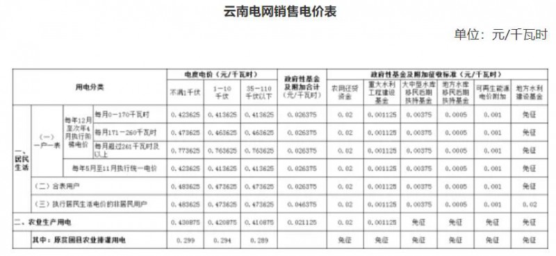 注:上表所列價格,居民生活用電和農(nóng)業(yè)生產(chǎn)用電價格含國家重大水利工程建設(shè)基金0.1125分錢,居民生活用電價格含大中型水庫移民后期扶持基金0.12分錢。