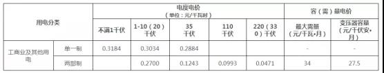 注:1.表中各電價含增值稅、線損、交叉補貼及區(qū)域電網(wǎng)容量電價,不含政府性基金及附加。2.政府性基金及附加標(biāo)準(zhǔn)分別為農(nóng)網(wǎng)還貸資金2分/千瓦時、國家重大水利工程建設(shè)基金0.1125分/千瓦時、可再生能源電價附加1.9分/千瓦時、大中型水庫移民后期扶持基金0.62分/千瓦時。3.110千伏及以上“網(wǎng)對網(wǎng)”外送電省外購電用戶承擔(dān)的送出省平均輸電價格為每千瓦時不超過0.022元(含稅、含線損、下同),最高不超過每千瓦時0.03元。4.變壓器容量在315千伏安及以上的一般工商業(yè)及其他用戶可選擇執(zhí)行表中大工業(yè)生產(chǎn)用電兩部制電價。