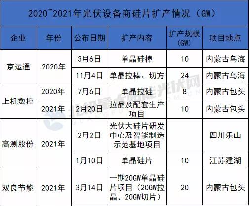 而2021年截至目前,隆基暫未公開硅片相關(guān)擴(kuò)產(chǎn)計(jì)劃,2020年其在云南新擴(kuò)70GW單晶產(chǎn)能。