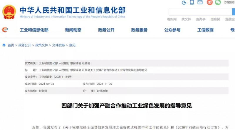 近期,我國(guó)發(fā)布了《關(guān)于完整準(zhǔn)確全面貫徹新發(fā)展理念做好碳達(dá)峰碳中和工作的意見(jiàn)》和《2030年前碳達(dá)峰行動(dòng)方案》。為貫徹落實(shí)習(xí)近平總書(shū)記關(guān)于金融服務(wù)實(shí)體經(jīng)濟(jì)系列重要指示精神和黨中央、國(guó)務(wù)院關(guān)于碳達(dá)峰、碳中和重大決策部署,工業(yè)和信息化部、人民銀行、銀保監(jiān)會(huì)、證監(jiān)會(huì)聯(lián)合發(fā)布《關(guān)于加強(qiáng)產(chǎn)融合作推動(dòng)工業(yè)綠色發(fā)展的指導(dǎo)意見(jiàn)》(工信部聯(lián)財(cái)〔2021〕159號(hào)),建立商業(yè)可持續(xù)的產(chǎn)融合作推動(dòng)工業(yè)綠色發(fā)展路徑,推動(dòng)建設(shè)工業(yè)綠色低碳轉(zhuǎn)型與工業(yè)賦能綠色發(fā)展相互促進(jìn)、深度融合的產(chǎn)業(yè)體系,以工業(yè)綠色化引領(lǐng)高端化、智能化發(fā)展,促進(jìn)工業(yè)穩(wěn)增長(zhǎng)和有效投資,助力制造強(qiáng)國(guó)和網(wǎng)絡(luò)強(qiáng)國(guó)建設(shè),推動(dòng)經(jīng)濟(jì)社會(huì)綠色發(fā)展,為應(yīng)對(duì)全球氣候變化貢獻(xiàn)力量。