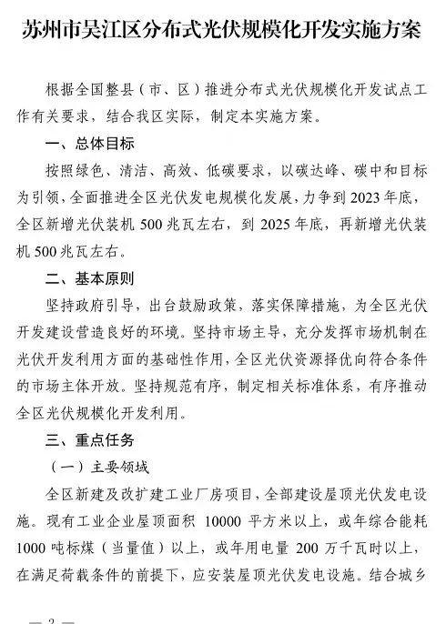 蘇州市吳江區(qū)人民政府發(fā)布印發(fā)吳江區(qū)分布式光伏規(guī)?;_(kāi)發(fā)實(shí)施方案的通知。