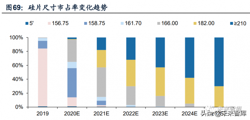 (1)背景:大尺寸化推動多環(huán)節(jié)降本,滲透提升成必然趨勢。在制造端,大尺寸硅片可以提升硅片、電池和組件產(chǎn)出量,從而攤薄單位生產(chǎn)成本;在組件端, 大尺寸硅片能夠有效提升組件功率,通過優(yōu)化電池和組件的設(shè)計提高組件效率,降低單瓦成本;在系統(tǒng)端,單片組件功率和轉(zhuǎn)換效率的提升可以減少支架及匯流箱等 固定成本。因此,大尺寸化能夠有效攤薄各環(huán)節(jié)加工及BOS成本,推動度電成本下降,大尺寸趨勢確定。據(jù)PV-Infolink預(yù)測,2020年硅片市場仍以158/166mm為 主,市占率為74%,但2021年時182/210mm尺寸硅片市占率將擴大至18%,此后逐年上升。