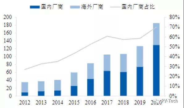 除了頭部企業(yè)外,國內(nèi)逆變器廠商崛起的另一個佐證則是近年來出貨占比的不斷提升,根據(jù)Wood Mackenzie的數(shù)據(jù)統(tǒng)計,2012年國內(nèi)廠商的出貨量在全球的占比不到30%,到2020年這一數(shù)據(jù)已攀升至70%。