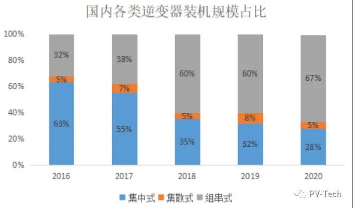總體來看,在新增裝機(jī)和存量替換的雙重驅(qū)動下,逆變器的市場需求持續(xù)向好。而從需求產(chǎn)品類型來看,組串式逆變器已經(jīng)占據(jù)主要地位。中國光伏行業(yè)協(xié)會的年度報告數(shù)據(jù)顯示,2020年組串式逆變器的市場占有率較2019年的59.4%上升至66.5%。