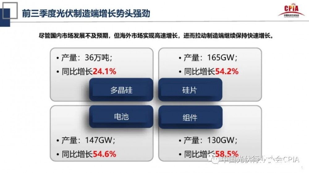 在此次會議上,王勃華對光伏行業(yè)的發(fā)展情況做了詳細介紹。在光伏制造端方面,他指出,2021年前三季度光伏制造端增長勢頭強勁,在光伏制造端四個環(huán)節(jié)中,多晶硅產量為36萬噸,同比增長24.1%;硅片產量為165GW,同比增長54.2%;電池產量為147GW,同比增長54.6%;組件產量為130GW,同比增長58.5%。他表示,盡管國內市場發(fā)展不及預期,但海外市場實現(xiàn)了高速增長,進而拉動光伏制造端繼續(xù)保持快速增長。因此,光伏制造端在今年仍處于快速發(fā)展中。