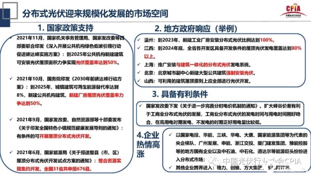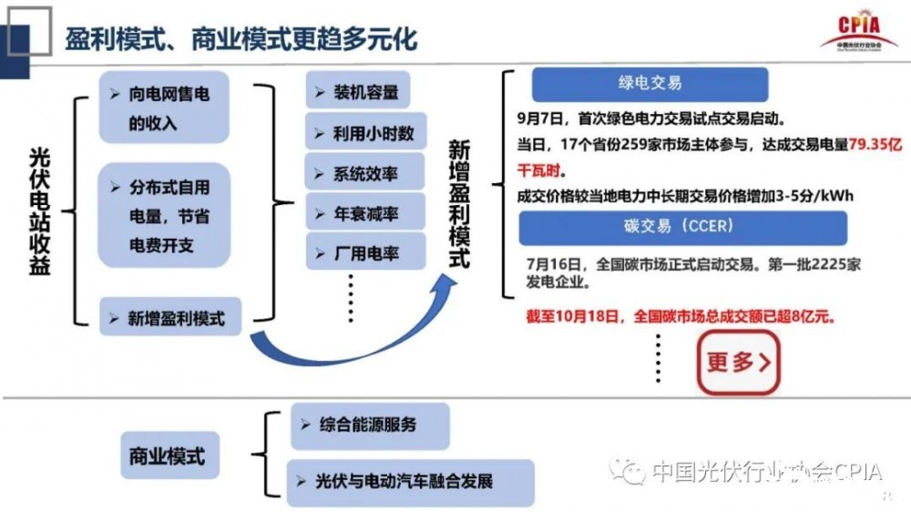 王勃華還指出,未來分布式光伏將迎來規(guī)?;l(fā)展的市場空間。究其原因是,第一,國家、地方政策的支持,以央企為梯隊,地方國有企業(yè)和跨界能源巨頭企業(yè)為代表紛紛進入分布式市場。第二,光伏盈利模式、商業(yè)模式的多元化。盈利上光伏電站收益新增綠電交易和碳交易(CCER)等盈利模式,商業(yè)模式方面是綜合能源服務和光伏與電動汽車融合發(fā)展。