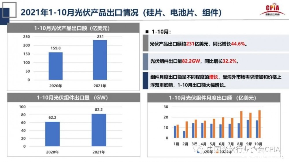 對其增長的原因,王勃華分析稱:“其一是組件月度出口額量不同程度的增長,1-10月光伏組件出口量為82.2GW,同比增長了32.2%,根據(jù)往年數(shù)據(jù)對比,組件每月出口數(shù)據(jù)都有超過去年。其二是受海外市場需求增加和價格上浮雙重影響,1-10月光伏產品出口額呈現(xiàn)大幅增長趨勢。”