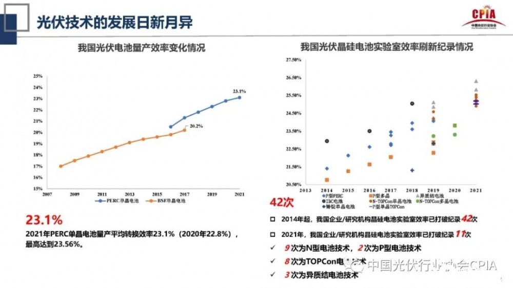 在光伏技術方面,王勃華形容其為“日新月異”。特別在轉換效率方面,2021年我國PERC單晶電池量平均轉換效率達23.1%,最高達到23.56%。而2020年僅有22.8%。在光伏晶硅電池實驗室效率方面,從2014年起至今8年時間,我國企業(yè)/研究機構晶硅電池實驗室效率已打破紀錄42次,2021年,我國企業(yè)/研究機構晶硅電池實驗室效率已打破紀錄11次。其中,9次為N型電池技術,2次為P型電池技術,8次為TOPCon電池技術,3次為異質結電池技術。