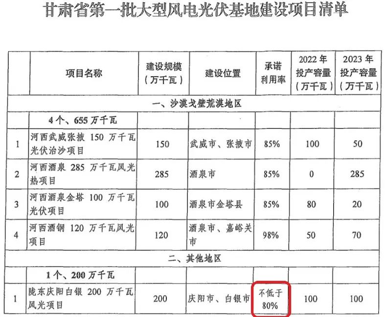 在國家能源局、國家發(fā)改委印發(fā)的《第一批以沙漠、戈壁、荒漠地區(qū)為重點(diǎn)的大型風(fēng)電、光伏基地建設(shè)項(xiàng)目清單的通知》中,青海省僅僅給出了84%的利用率承諾;而甘肅的一個基地,甚至只敢承諾80%!