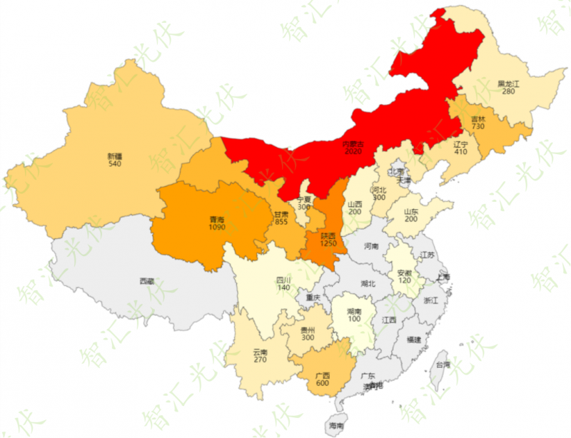 2021年11月24日,國家能源局、國家發(fā)改委印發(fā)的《第一批以沙漠、戈壁、荒漠地區(qū)為重點(diǎn)的大型風(fēng)電、光伏基地建設(shè)項(xiàng)目清單的通知》,涉及19省份,規(guī)模總計(jì)97.05GW。各省具體的規(guī)模如下圖所示。