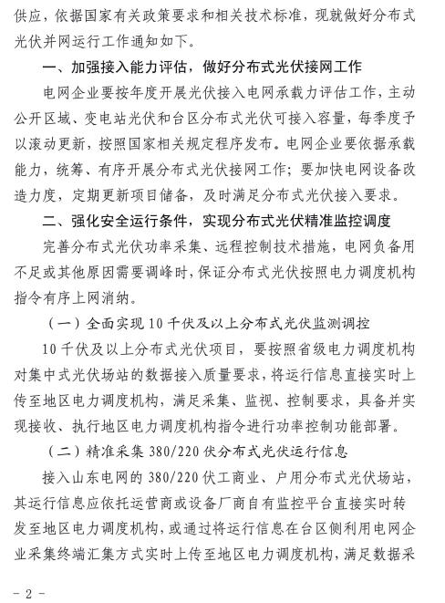 近日,國家能源局山東監(jiān)管辦公室 山東省能源局發(fā)布關(guān)于切實做好分布式光伏并網(wǎng)運行工作的通知,通知指出四點,一、加強接入能力評估,做好分布式光伏接網(wǎng)工作;二、強化安全運行條件,實現(xiàn)分布式光伏精準監(jiān)控調(diào)度;三、規(guī)范涉網(wǎng)技術(shù)參數(shù),保證分布式光伏并網(wǎng)性能;四、加強協(xié)同聯(lián)動,強化監(jiān)督考核。