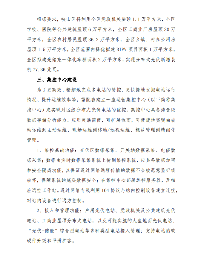 為深入貫徹落實(shí)鄉(xiāng)村振興戰(zhàn)略,努力實(shí)現(xiàn)國(guó)家碳達(dá)峰、碳中和戰(zhàn)略任務(wù),統(tǒng)籌推進(jìn)“源網(wǎng)荷儲(chǔ)-智慧協(xié)同”的分布式光伏建設(shè),打造全國(guó)“雙碳”示范區(qū),根據(jù)峽山區(qū)本地光照條件和屋頂資源情況,結(jié)合國(guó)家能源局政策要求,峽山區(qū)將利用全區(qū)黨政機(jī)關(guān)屋頂 1.1 萬(wàn)平方米,全區(qū)學(xué)校、醫(yī)院等公共建筑屋頂 6 萬(wàn)平方米,全區(qū)工商業(yè)廠房屋頂 30 萬(wàn)平方米,全區(qū)農(nóng)村居民屋頂36.2 萬(wàn)平方米,全區(qū)鄉(xiāng)鎮(zhèn)、村辦公用房屋頂 1.5 萬(wàn)平方米,全區(qū)范圍內(nèi)擇優(yōu)擬建 BIPV 項(xiàng)目面積 1 萬(wàn)平方米,全區(qū)擬建光儲(chǔ)充一體化車棚面積 2 萬(wàn)平方米,實(shí)現(xiàn)分布式光伏新增裝機(jī) 77.36 兆瓦。