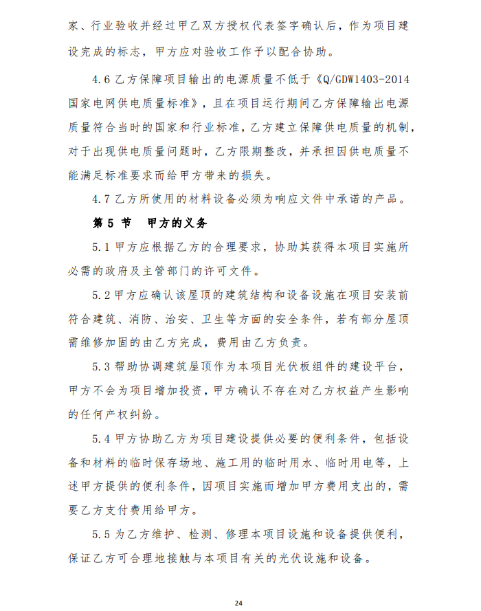 4、由于光伏發(fā)電項(xiàng)目運(yùn)行生命周期長(zhǎng),安裝用戶點(diǎn)多,面大,為保障安裝戶的權(quán)益,維護(hù)社會(huì)穩(wěn)定,建設(shè)企業(yè)要提供明確的長(zhǎng)期運(yùn)維方案及保障費(fèi)用,具體以運(yùn)維合同為準(zhǔn)。