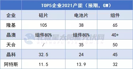 再以TOP5組件企業(yè)為例,各大龍頭紛紛補足短板,夯實一體化基礎(chǔ)。其中一體化最為均衡的為晶澳科技,硅片、電池產(chǎn)能保持為組件產(chǎn)能的80%。