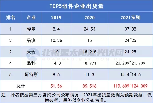 梳理2017年~2021年連續(xù)5年全球組件出貨量排名,TOP5企業(yè)巋然不對,僅排序略有變化。2019年,TOP5企業(yè)即隆基、晶科、天合、晶澳、阿特斯5家企業(yè)組件總出貨量51.56GW,2020年這一數(shù)字增長至85.5GW,而2021年再攀高峰突破120GW。據(jù)BNEF彭博新能源財經(jīng)預(yù)測,2021年全球光伏新增裝機或達(dá)183GW。這也意味著TOP5組件企業(yè)的市場占比達(dá)到六成以上。