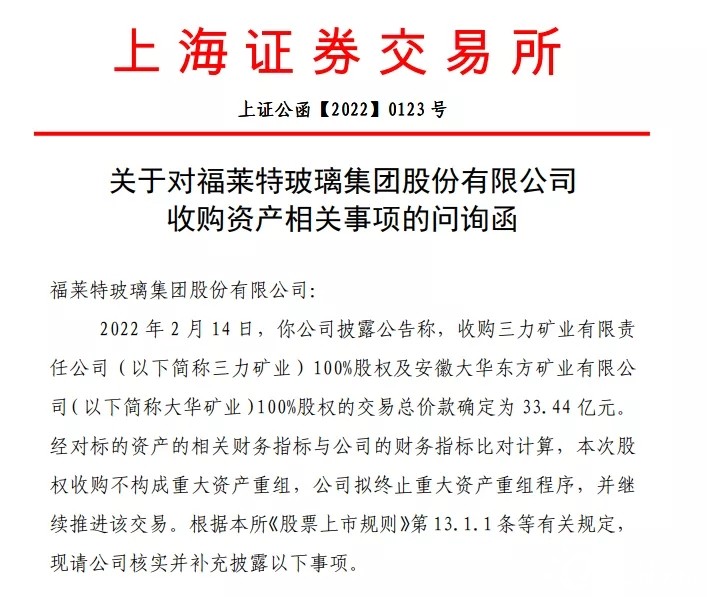 上交所近期發(fā)布問詢函,就光伏玻璃巨頭福萊特對(duì)三力礦業(yè)、安徽大華東方礦業(yè)等100%股權(quán)的收購(gòu)案進(jìn)行問詢,兩項(xiàng)收購(gòu)額總計(jì)為33.44億。