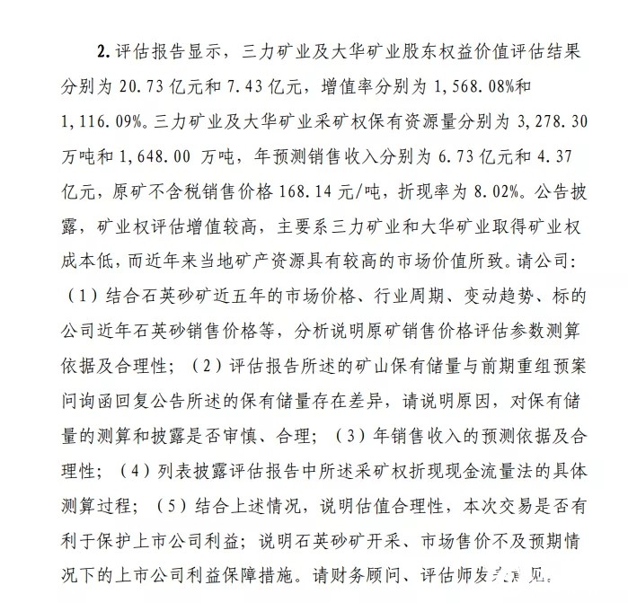 同時(shí),上交所也指出,上述兩家(擬被收購(gòu))公司的股東權(quán)益價(jià)值評(píng)估結(jié)果分別為20.73億和7.43億,增值率為1568%和1116%,兩家公司的年預(yù)測(cè)銷售收入為6.73億和4.37億,請(qǐng)福萊特對(duì)石英砂礦的近五年市場(chǎng)價(jià)、行業(yè)周期、變動(dòng)趨勢(shì)和標(biāo)的公司近年來(lái)石英砂銷售價(jià)等,分析說明原礦銷售價(jià)評(píng)估參數(shù)測(cè)算依據(jù)及合理性。同時(shí)也說明年銷售收入的預(yù)測(cè)依據(jù)、估值的合理性等。