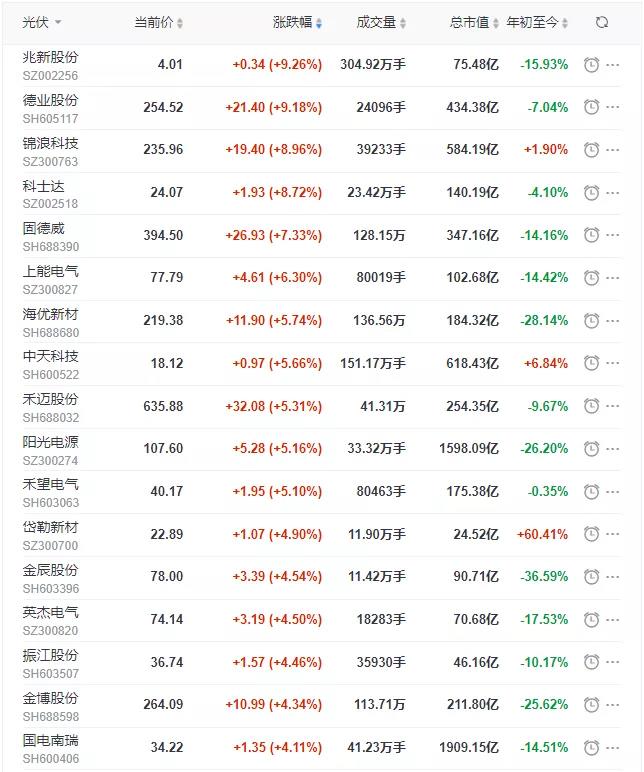 個股方面,兆新股份、德業(yè)股份漲超9%,錦浪科技漲幅達到8.96%,固德威漲超7%,上能電氣漲超6%,禾邁股份、陽光電源等漲超5%,天合光能、賽伍技術、中來股份、通威股份、晶澳科技等漲超3%,正泰電器、中信博、特變電工、高測股份、隆基股份等漲超2%,邁為股份、愛旭股份、通靈股份、東方日升等漲超1%。