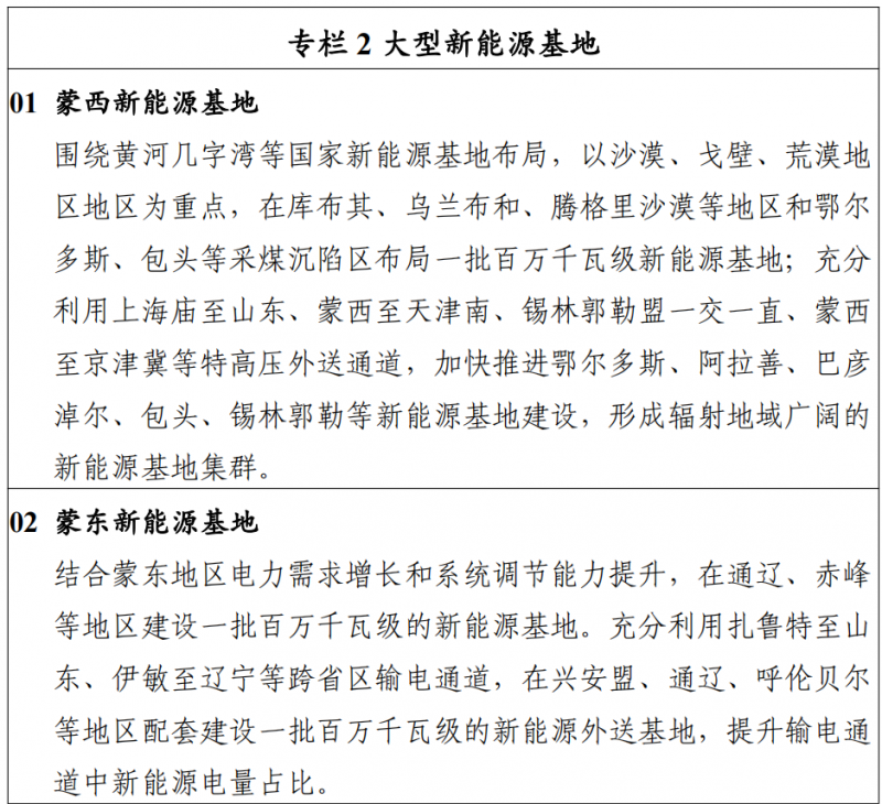 因地制宜推進太陽能熱發(fā)電發(fā)展。總結首批太陽能熱發(fā)電示范項目建設經(jīng)驗,發(fā)揮太陽能熱發(fā)電儲能調(diào)節(jié)能力和系統(tǒng)支撐能力,因地制宜建設太陽能熱發(fā)電項目。充分發(fā)揮太陽能熱發(fā)電在電力系統(tǒng)中調(diào)峰、調(diào)頻、儲能等多元功能,統(tǒng) 籌推動太陽能熱發(fā)電與風電光伏基地一體化建設運行,為新能源高比例自用和外送提供支撐,力爭“十四五”期間新增并網(wǎng)太陽能熱發(fā)電項目 50 萬千瓦。加快推進新型儲能技術規(guī)模化應用。探索采用自建、合建、租賃和共享等多元化模式,加快推動新型儲能在發(fā)電側、 電網(wǎng)側、用戶側的規(guī)?;瘧?,實現(xiàn)新能源與新型儲能的協(xié)同發(fā)展,原則上新建新能源項目要配置 15%(2 小時)以上的儲能設施。研究出臺存量新能源項目增配儲能的管理辦法,推動已并網(wǎng)的新能源項目增配儲能設施,提高消納和調(diào)峰能力。在充分發(fā)揮電力外送通道配套火電機組深度調(diào)峰能力的基礎上,合理規(guī)劃建設送端配套新型儲能設施,支撐大規(guī)模風、光等可再生能源電源接入,提升外送通道可再生能源電量占比。二、充分提升可再生能源就地消納水平加快配套電網(wǎng)建設。優(yōu)化升級電網(wǎng)主網(wǎng)架,解決電網(wǎng)結構性問題,提升電力互濟能力,提高電網(wǎng)運行效率和安全穩(wěn)定水平。加快推動新能源送出工程建設,滿足新能源大規(guī)模開發(fā)的匯集與送出需求。推動配電網(wǎng)擴容改造和智能化升 級,提升配電網(wǎng)柔性開放接入能力、靈活控制能力和抗擾動能力,增加電網(wǎng)就地就近平衡能力,構建適應分布式可再生能源并網(wǎng)和多元負荷需要的智能配電網(wǎng)。提升系統(tǒng)調(diào)節(jié)能力。積極推進煤電靈活性改造,推動自備電廠主動參與調(diào)峰,加快建設天然氣調(diào)峰電站,充分提升系統(tǒng)調(diào)節(jié)能力。優(yōu)化電力調(diào)度運行,合理安排系統(tǒng)開機方式, 動態(tài)調(diào)整各類電源發(fā)電計劃,探索推進多種電源聯(lián)合調(diào)度。創(chuàng)新調(diào)度運行與市場機制,促進可再生能源在省級電網(wǎng)內(nèi)就地消納。三、穩(wěn)步有序推動可再生能源外送消納充分發(fā)揮自治區(qū)可再生能源資源優(yōu)勢和區(qū)位優(yōu)勢,按照提升一批、投產(chǎn)一批、開工一批的發(fā)展思路,努力提高輸電 通道中新能源電量的占比,提高特高壓輸電通道利用率,大力提升可再生能源外送消納能力,有序推動國家級新能源電力供應保障基地建設,助力全國碳達峰碳中和。“十四五” 期間,規(guī)劃新增新能源外送基地 2900 萬千瓦,力爭累計投產(chǎn) 3900 萬千瓦。加快推動已批復新能源外送基地投產(chǎn)運行。加快推動錫林郭勒盟“一交一直”一期、上海廟至山東一期、扎魯特至青州特高壓輸電通道配套新能源基地、烏蘭察布風電基地等已批復新能源基地建設進度,力爭 2025 年前建成投產(chǎn) 1500 萬千瓦左右。提升既有外送通道中新能源電量占比。提高自治區(qū)可再生能源外送規(guī)模,在蒙西至天津南交流特高壓、上海廟至山 東直流特高壓、錫林郭勒盟交直流特高壓等既有特高壓外送 輸電通道以及傳統(tǒng)火電廠外送專線基礎上,統(tǒng)籌送端周邊地區(qū)資源條件和環(huán)境約束,合理優(yōu)化風能、太陽能資源配置方 案,增配布局一批新能源基地,大幅提高存量外送輸電通道中可再生能源占比和通道利用效率,“十四五”期間建成外送新能源 1900 萬千瓦。積極推進新建蒙西外送通道配套新能源基地開工建設。統(tǒng)籌優(yōu)化蒙西地區(qū)風能、太陽能資源和接入條件,在資源稟賦較好、開發(fā)建設條件優(yōu)越、具備持續(xù)整裝開發(fā)條件的地區(qū), 推進風能、太陽能、煤炭等多能互補發(fā)展,有序建設一批百萬千瓦級新能源基地,實現(xiàn)高比例可再生能源外送,力爭2025 年前推動開工配套新能源基地 1000 萬千瓦。