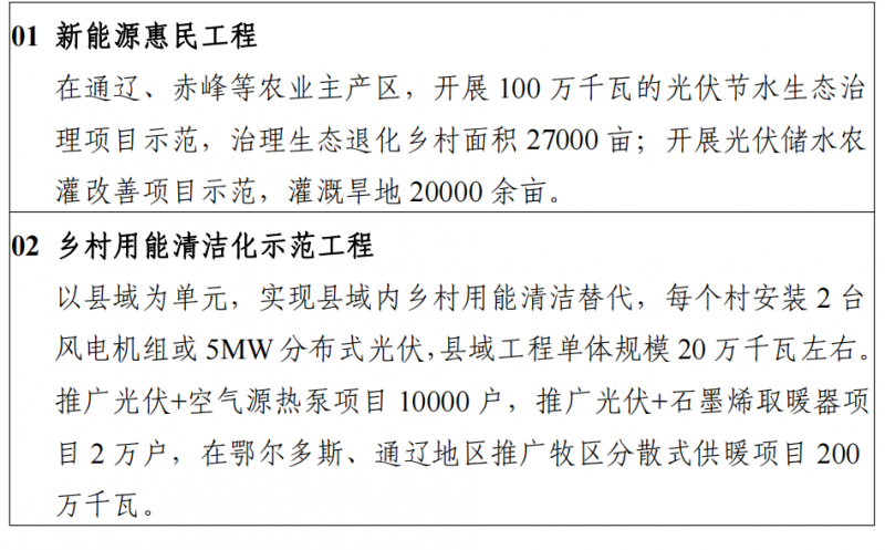 五、加快推動農(nóng)村能源革命助力鄉(xiāng)村振興新能源惠民工程。開展農(nóng)網(wǎng)鞏固提升工程,與提升風電、光伏等分布式電能就近接入有機結合,提升鄉(xiāng)村電氣化水平,提高農(nóng)電服務水平,推進農(nóng)網(wǎng)智能化。在電網(wǎng)基礎建設薄弱且用電負荷分散度較高的偏遠末端配電網(wǎng)、農(nóng)區(qū)牧區(qū)等地區(qū),因地制宜推動風電、光伏開發(fā)。在通遼、赤峰等盟市, 開展光伏儲水農(nóng)灌改善工程和光伏節(jié)水生態(tài)治理工程示范, 提升電網(wǎng)農(nóng)灌期供電可靠性,構建新型節(jié)水灌溉系統(tǒng),有效實現(xiàn)節(jié)水節(jié)能、生態(tài)恢復治理。自治區(qū)鄉(xiāng)村人口約 960 萬人,開展 100 萬千瓦新能源惠民工程,滿足農(nóng)村牧區(qū)清潔用能需求。鄉(xiāng)村用能清潔化示范工程。推動鄉(xiāng)村產(chǎn)業(yè)、農(nóng)業(yè)生產(chǎn)和農(nóng)村生活用能清潔化,以分布式光伏、分散式風電、地熱能利用為核心,開展智慧用能大棚、清潔供暖、綠色出行等智慧用能示范。加快提升呼包鄂周邊、蒙東鄉(xiāng)村可再生能源供暖水平,合理配比分散式風電和分布式光伏,利用電熱膜、電鍋爐、空氣源熱泵、石墨烯取暖器等供暖設施,形成清潔能源支持產(chǎn)業(yè)發(fā)展、產(chǎn)業(yè)發(fā)展助力鄉(xiāng)村振興的農(nóng)村安居環(huán) 境。在通遼、鄂爾多斯等農(nóng)牧區(qū),開展牧區(qū)清潔供暖示范項目,探索離網(wǎng)式新能源供電供熱模式,滿足農(nóng)村牧區(qū)清潔用能需求。在蒙東地區(qū)人口密集的旗縣,充分利用當?shù)亟斩捹Y源開展生物質(zhì)發(fā)電供暖示范,實現(xiàn)旗縣區(qū)域生物質(zhì)供暖規(guī)模化替代,提升可再生能源消費占比,推廣生物質(zhì)碳化與固化及高效低排節(jié)能爐具。
