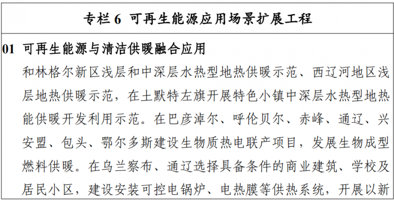 四、廣泛擴展可再生能源應用場景實施火電靈活性改造。加快存量煤電改造升級,推廣深度調(diào)峰技術應用,積極推進現(xiàn)役煤電機組實施靈活性改造, 鼓勵新建煤電機組靈活性制造,降低新建煤電機組最小技術出力水平,提升電力系統(tǒng)整體消納能力,促進新能源大規(guī)模開發(fā)和高效利用,引導煤電由主力電源逐步向“支撐型”、“調(diào) 節(jié)型”電源轉變。推進工業(yè)園區(qū)可再生替代。充分挖掘燃煤自備電廠園區(qū)的電源靈活調(diào)節(jié)能力和負荷側需求響應能力,推動園區(qū)自備電廠參與調(diào)峰,改變單一依靠自備火電的傳統(tǒng)供能方式,因地制宜推動風電、光伏建設,鼓勵集中式與分布式并舉,在 不占用公共電網(wǎng)的消納空間且保證用能安全的前提下實現(xiàn) 新能源全額自發(fā)自用,逐步實現(xiàn)園區(qū)用能清潔化。開展低碳工業(yè)園區(qū)示范。鼓勵具備新增負荷的園區(qū)開展低碳工業(yè)園示范項目,以近零碳用能為目標,率先開展全清潔能源供電,提升園區(qū)整體能效。通過自建分布式、新能源專線供電、綠色電力交易、綠證交易等多種方式,實現(xiàn)園區(qū)新增用電需求主要由新能源滿足。同時,鼓勵園區(qū)通過配置儲能等措施,保證與園區(qū)負荷的匹配響應和高比例自平衡, 不占用公共電網(wǎng)消納空間。推廣“綠電+綠氫”發(fā)展新模式。鼓勵采用具有適應可再生能源出力波動的綠色制氫技術,加快推進風光氫儲一體化示范,推廣氫燃料電池汽車在礦山、物流、公交等領域的規(guī)模化應用,積極探索氫能在冶金、化工、交通等領域的應用。開展源網(wǎng)荷儲一體化示范。充分挖掘和釋放生產(chǎn)側、消費側調(diào)節(jié)能力,最大化發(fā)揮負荷側調(diào)節(jié)響應能力,就近合理配套新能源,加強源網(wǎng)荷儲多向互動,通過電價優(yōu)勢帶動儲能、大數(shù)據(jù)、新能源、新材料等行業(yè)全產(chǎn)業(yè)鏈發(fā)展。加快烏蘭察布、通遼源網(wǎng)荷儲一體化示范工程建設,提升本地電源支撐,有效緩解供電缺口,推動局部新能源就近消納,不占用公共電網(wǎng)調(diào)峰和消納空間,提升新能源開發(fā)利用水平。持續(xù)推廣可再生能源清潔供暖。發(fā)揮自治區(qū)風能、光伏、農(nóng)林、地熱資源優(yōu)勢,建立多元化可再生能源清潔供暖體系, 促進環(huán)境質(zhì)量和人民生活條件改善。在呼包鄂城市群積極推動中深層地熱能規(guī)模化供暖示范,創(chuàng)新城市用能新模式。在蒙東地區(qū)發(fā)展生物質(zhì)熱電聯(lián)產(chǎn)項目,探索以農(nóng)林生物質(zhì)、生物質(zhì)成型燃料等為燃料的生物質(zhì)鍋爐供熱方式,有效保護城鄉(xiāng)環(huán)境。在呼和浩特、包頭、烏蘭察布、通遼等地,開展清潔電供暖示范。大力發(fā)展以新能源為主的綜合能源應用。結合配電網(wǎng)、燃氣網(wǎng)、熱力網(wǎng)等能源網(wǎng)絡,綜合可再生能源、儲能、信息通訊等先進技術,推動分布式可再生能源高效靈活接入與生產(chǎn)消費一體化,建設冷熱水電氣供應的區(qū)域綜合能源系統(tǒng)。