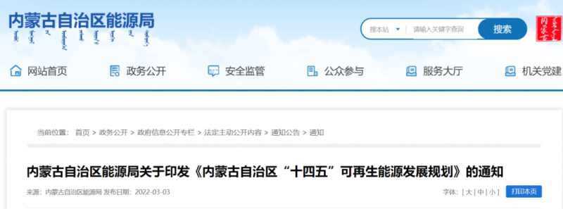 2022年3月2日,內(nèi)蒙古自治區(qū)能源局關于印發(fā)《內(nèi)蒙古自治區(qū)“十四五”可再生能源發(fā)展規(guī)劃》,提出:"十四五"末,內(nèi)蒙古可再生能源發(fā)電裝機達到 1.35 億千瓦以上,其中風電 8900 萬千瓦、光伏發(fā)電 4500 萬千瓦,相當于新增風電項目5115萬千瓦,光伏項目3262萬千瓦,共8377萬千瓦,包含本地消納和外送兩類。平均利用率保持在 90%以上。同時,將依據(jù)國土空間規(guī)劃,完善可再生能源空間用途管制規(guī)則,保障可再生能源開發(fā)利用合理的用地空間需求。落實草原林地征占用分區(qū)管控政策,保障可再生能源項目使用草原林地需求。規(guī)范土地性質(zhì)認定,明確林草等不同地類的用地標準。