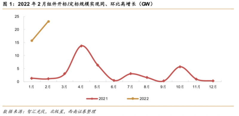 除同比爆發(fā)式增長外,如若著眼于月度間變化,我們認(rèn)為2月需求表現(xiàn)持續(xù)向好。從總量來看,2月開標(biāo)/定標(biāo)規(guī)模達(dá)23.2GW,環(huán)比增長47.3%;從單項目規(guī)模上看,華電集團(tuán)15GW組件集采大單具有較強代表性。