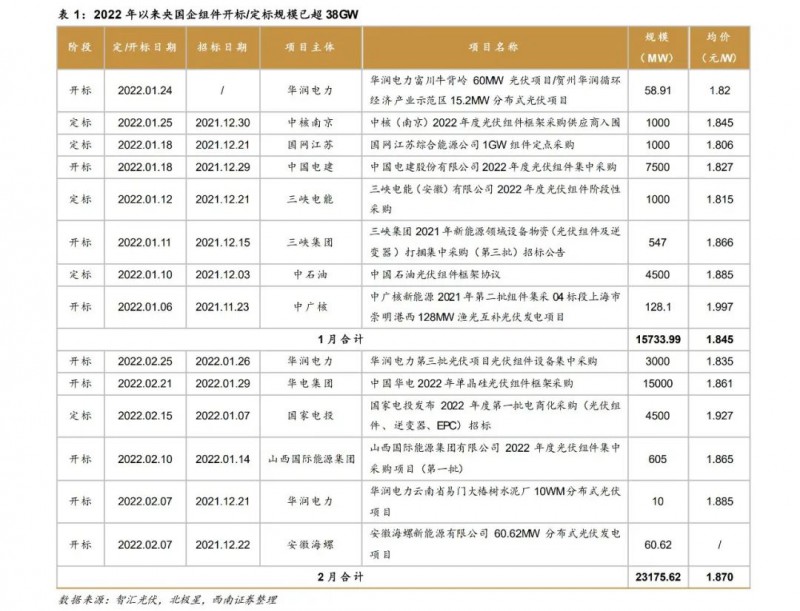 地面電站裝機(jī)需求釋放,央國企組件開標(biāo)熱潮開啟。2021年12月上旬硅片庫存去化、產(chǎn)業(yè)鏈價格回落,地面電站的組件招標(biāo)逐步啟動;疊加部分項目延期、補裝組件等因素,2022開年來終端需求呈現(xiàn)爆發(fā)式增長。根據(jù)我們統(tǒng)計,2022年1-2月,以央國企為主的組件開標(biāo)/定標(biāo)規(guī)模已達(dá)38.9GW??紤]到統(tǒng)計信息的不完全性,實際開標(biāo)/定標(biāo)規(guī)模有望達(dá)到40GW,終端需求表現(xiàn)強勢。