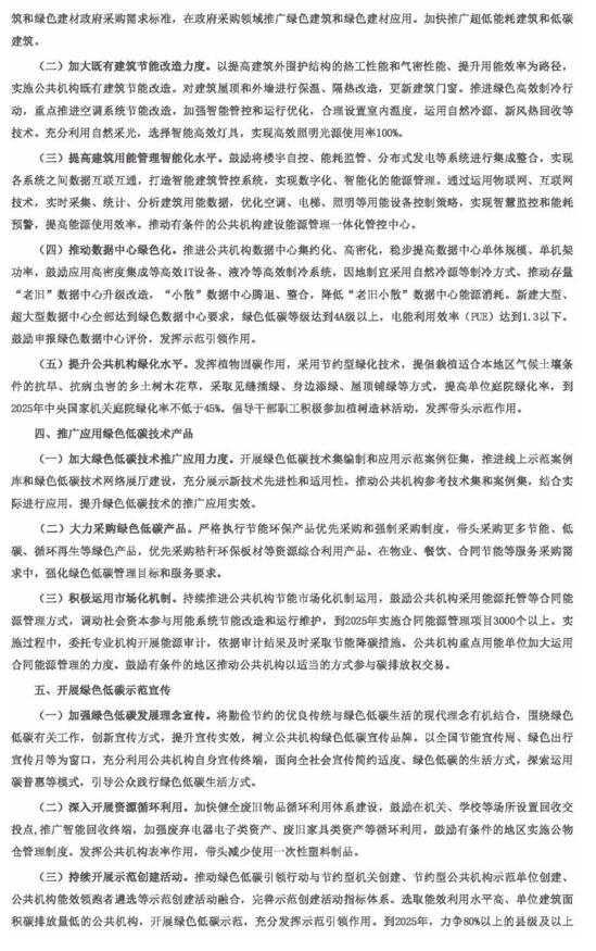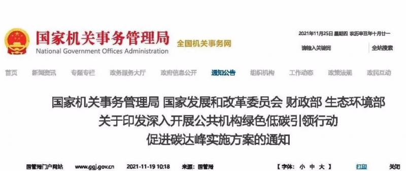國家機關(guān)事務(wù)管理局、國家發(fā)改委、財政部、生態(tài)環(huán)境部發(fā)布關(guān)于印發(fā)深入開展公共機構(gòu)綠色低碳引領(lǐng)行動、促進碳達峰實施方案的通知。
