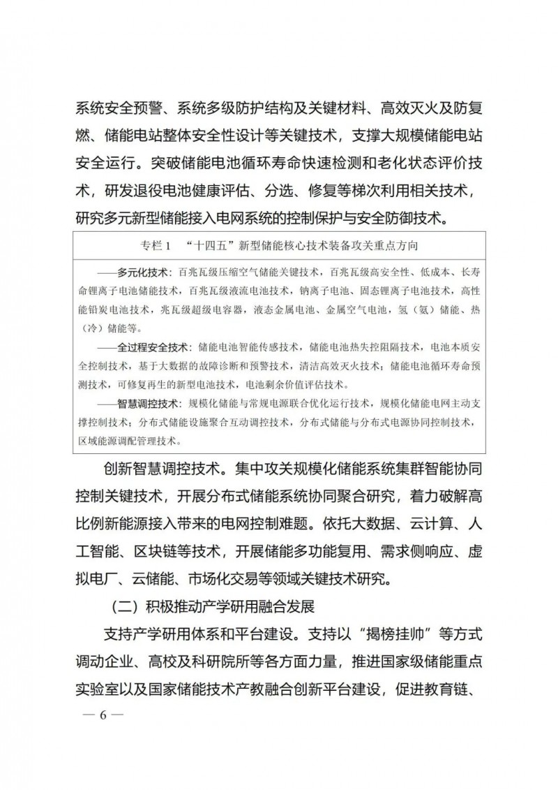 《實(shí)施方案》分為八大部分,包括總體要求、六項(xiàng)重點(diǎn)任務(wù)和保障措施。其中,六項(xiàng)重點(diǎn)任務(wù)分別從技術(shù)創(chuàng)新、試點(diǎn)示范、規(guī)模發(fā)展、體制機(jī)制、政策保障、國際合作等重點(diǎn)領(lǐng)域?qū)?ldquo;十四五”新型儲(chǔ)能發(fā)展的重點(diǎn)任務(wù)進(jìn)行部署。