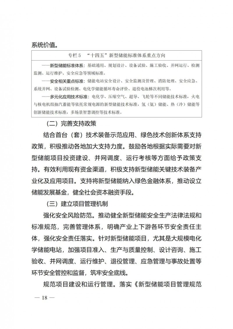 五是著力健全新型儲(chǔ)能管理體系?!秾?shí)施方案》強(qiáng)化標(biāo)準(zhǔn)的規(guī)范引領(lǐng)和安全保障作用,完善新型儲(chǔ)能全產(chǎn)業(yè)鏈標(biāo)準(zhǔn)體系,加快制定安全相關(guān)標(biāo)準(zhǔn),開展多元化應(yīng)用技術(shù)標(biāo)準(zhǔn)制修訂。要求加快建立新型儲(chǔ)能項(xiàng)目管理機(jī)制,規(guī)范行業(yè)管理,強(qiáng)化安全風(fēng)險(xiǎn)防范。鼓勵(lì)各地加大新型儲(chǔ)能技術(shù)創(chuàng)新和項(xiàng)目建設(shè)支持力度,完善相關(guān)支持政策。加快建立新型儲(chǔ)能項(xiàng)目管理機(jī)制,強(qiáng)化安全風(fēng)險(xiǎn)防范,規(guī)范項(xiàng)目建設(shè)和運(yùn)行管理。