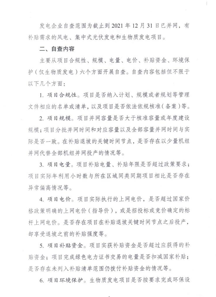 發(fā)電企業(yè)自查范圍為截止到2021年12月31日已并網(wǎng),有補貼需求的風電、集中式光伏發(fā)電和生物質(zhì)發(fā)電項目。