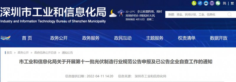 深圳市工業(yè)和信息化局發(fā)布關(guān)于開展第十一批光伏制造行業(yè)規(guī)范公告申報(bào)及已公告企業(yè)自查工作的通知。