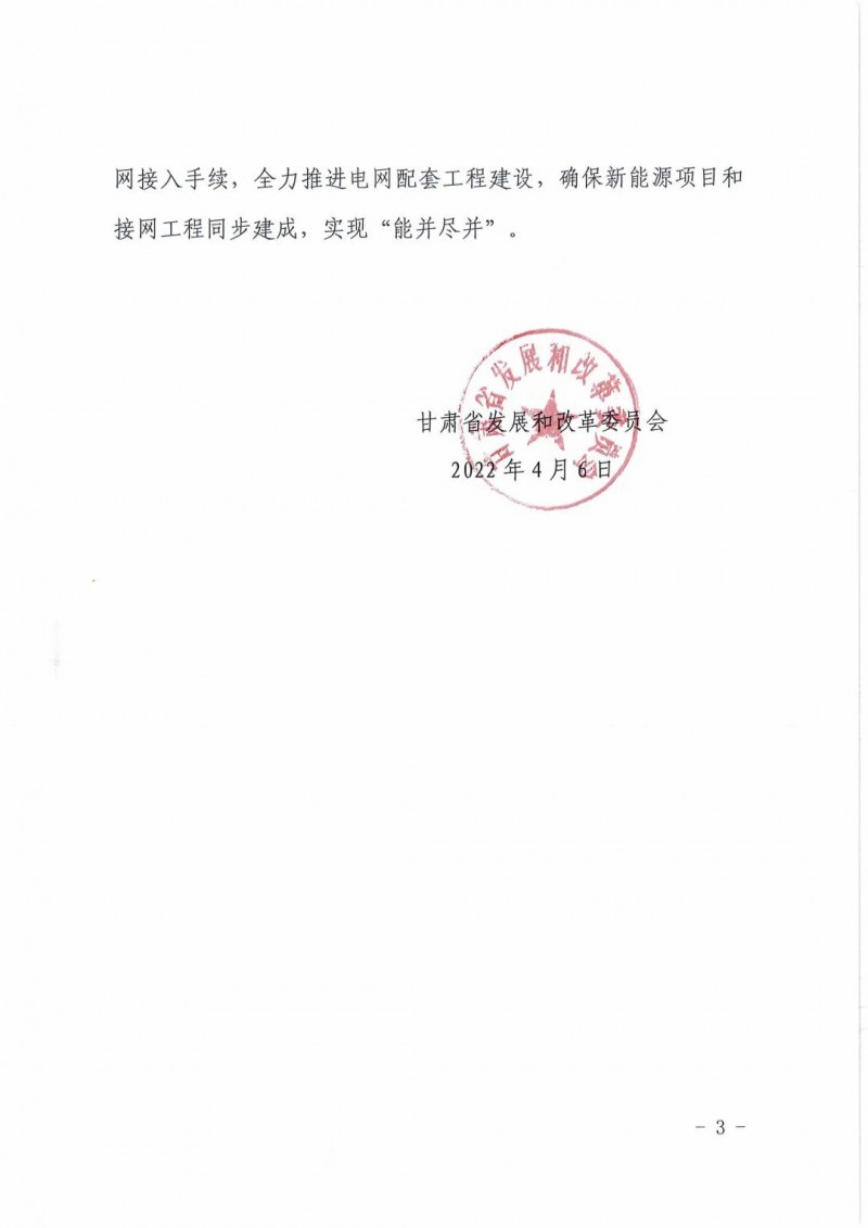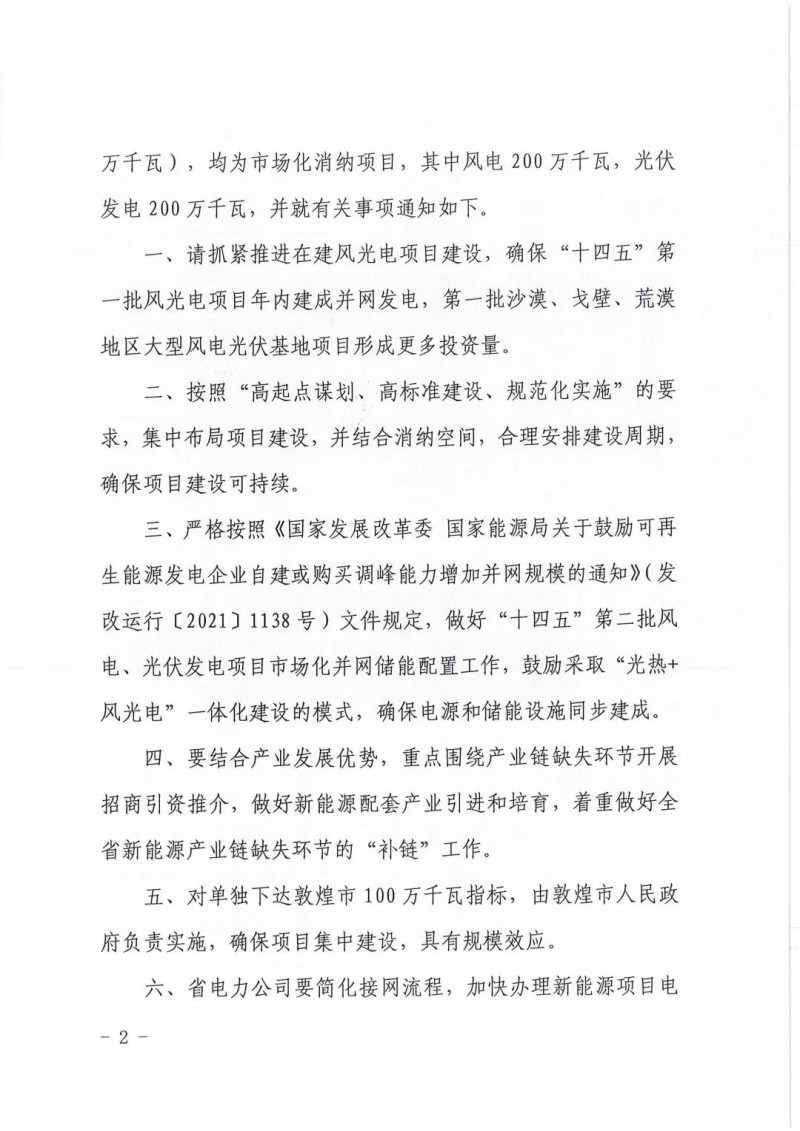 4月6日,甘肅省發(fā)展和改革委員會下發(fā)《關(guān)于下達(dá)酒泉市“十四五”第二批風(fēng)電、光伏發(fā)電項(xiàng)目建設(shè)指標(biāo)的通知》(甘發(fā)改能源〔2022)196號)?!锻ㄖ诽岢鼍迫?quot;十四五"第二批風(fēng)電、光伏發(fā)電項(xiàng)目指標(biāo)為400萬千瓦,實(shí)施時間為2023-2024年(包括專項(xiàng)安排敦煌市100萬千瓦),均為市場化消納項(xiàng)目,其中風(fēng)電200萬千瓦,光伏發(fā)電200萬千萬。