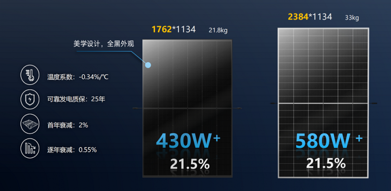 而今天(4月15日),天合光能推出的兩款組件,在外形尺寸方面卻有些“與眾不同”:430W產(chǎn)品外形尺寸1762*1134mm;580W產(chǎn)品外形尺寸2384*1134mm。