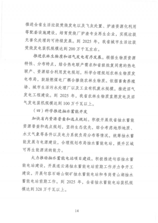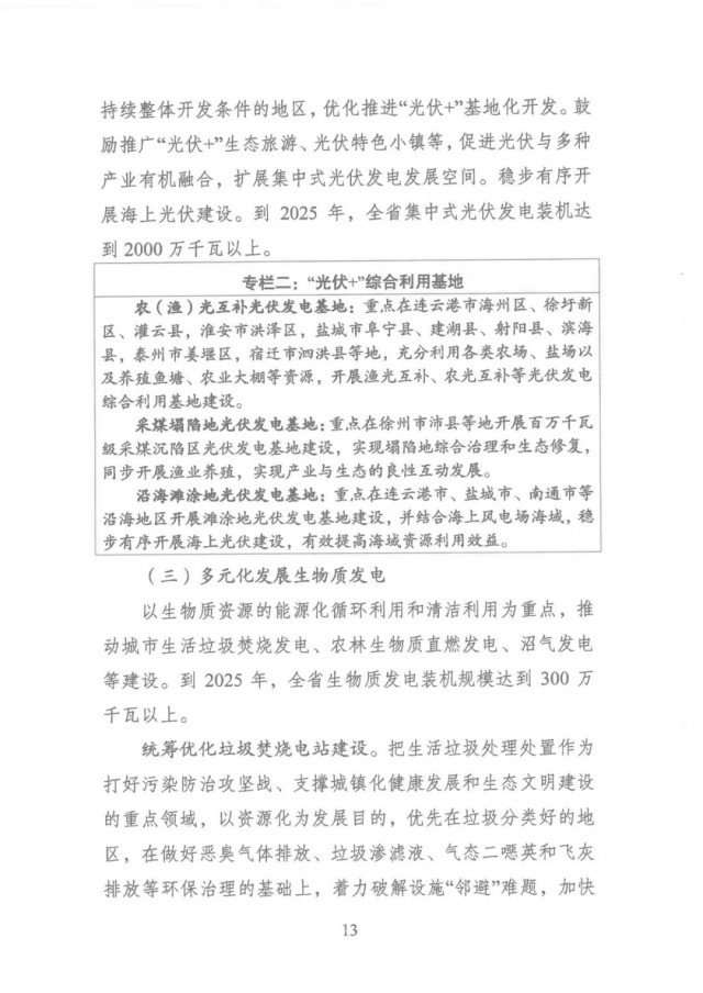 “十四五”期間,江蘇將穩(wěn)妥有序推進風電發(fā)展,優(yōu)化風電發(fā)展結構,重點發(fā)展海上風電,因地制宜發(fā)展光伏發(fā)電,全力推進分布式光伏發(fā)電,穩(wěn)步有序開展海上光伏建設,加快推進“光伏+”綜合利用,多元化發(fā)展生物質發(fā)電,科學推進抽水蓄能開發(fā),高效多元推動非電利用。到2025年,省內可再生能源占全省能源消費總量比重將達到15%以上,全省可再生能源裝機達到6600萬千瓦以上,占總裝機比重超過34%。其中,風電裝機達到2800萬千瓦以上,光伏發(fā)電裝機達到3500萬千瓦以上,生物質發(fā)電裝機達到300萬千瓦以上。