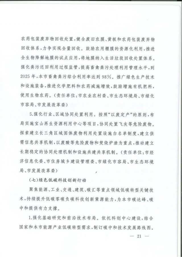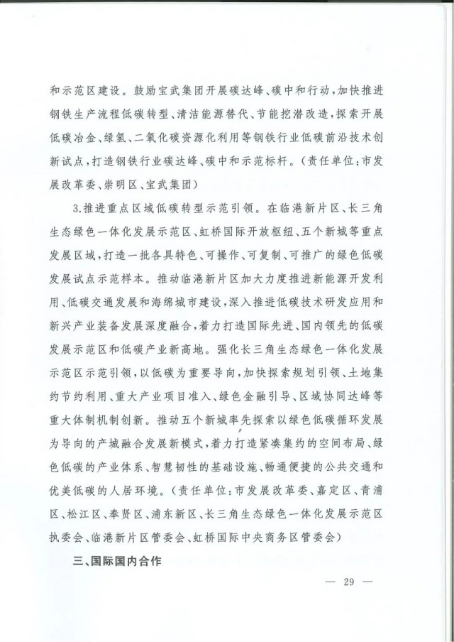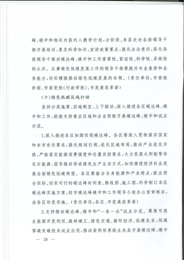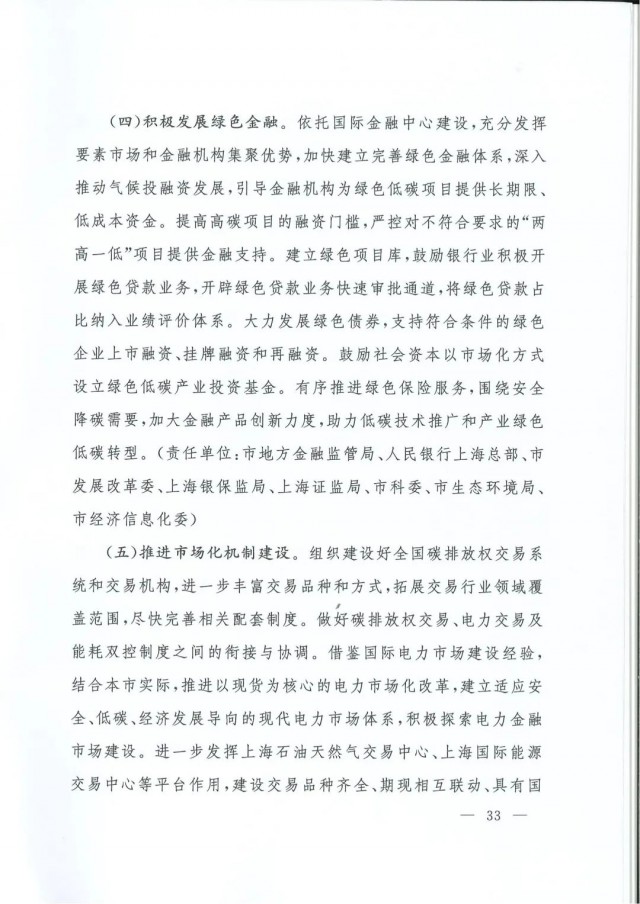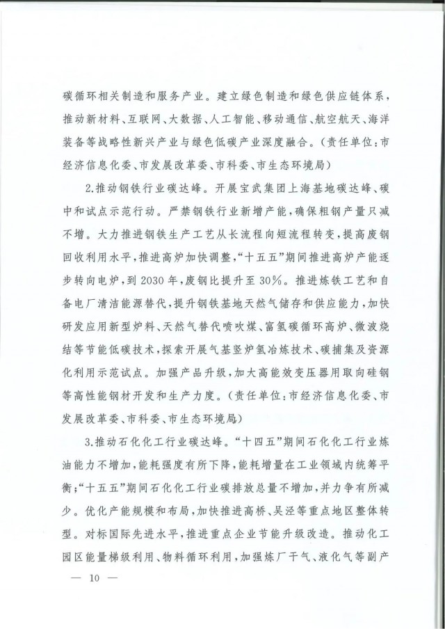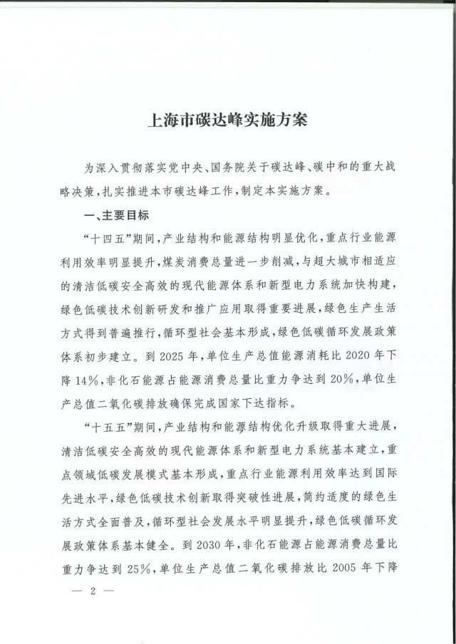 近日,上海市人民政府辦公廳印發(fā)了《上海市碳達峰實施方案》?!斗桨浮访鞔_主要目標:到2025年,單位生產(chǎn)總值二氧化碳排放確保完成國家下達指標。到2030年單位生產(chǎn)總值二氧化碳排放比2005年下降70%,確保2030年前實現(xiàn)碳達峰。并計劃組織實施“碳達峰十大行動”,包括能源綠色低碳轉(zhuǎn)型行動、節(jié)能降碳增效行動、工業(yè)/城鄉(xiāng)建設(shè)/交通領(lǐng)域綠色低碳行動、循環(huán)經(jīng)濟助力降碳行動、綠色低碳科技創(chuàng)新行動、碳匯能力鞏固提升行動、綠色低碳全民行動、綠色低碳區(qū)域行動。