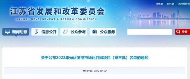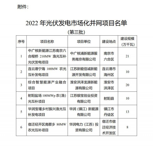 為積極貫徹落實國家“碳達峰碳中和”長期目標,推動我省光伏發(fā)電平穩(wěn)有序發(fā)展,按照《省發(fā)展改革委關(guān)于開展2022年光伏發(fā)電市場化并網(wǎng)項目開發(fā)建設的通知》(蘇發(fā)改能源發(fā)〔2022〕350號)有關(guān)要求,現(xiàn)將我省2022年光伏發(fā)電市場化并網(wǎng)項目(第三批)名單予以公布。
