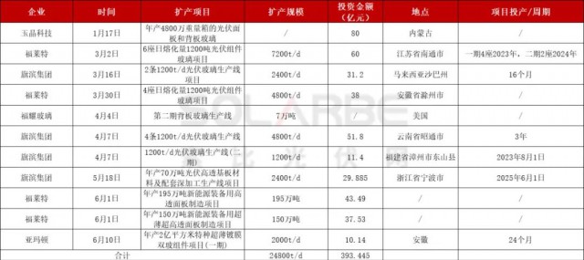 從上半年公布的光伏玻璃擴產(chǎn)信息來看,玉晶科技、福萊特、旗濱集團、福耀玻璃、亞瑪頓共計發(fā)布了超24800t/d(噸/日)玻璃擴產(chǎn)信息。然而,更多光伏玻璃擴產(chǎn)項目處于聽證階段。